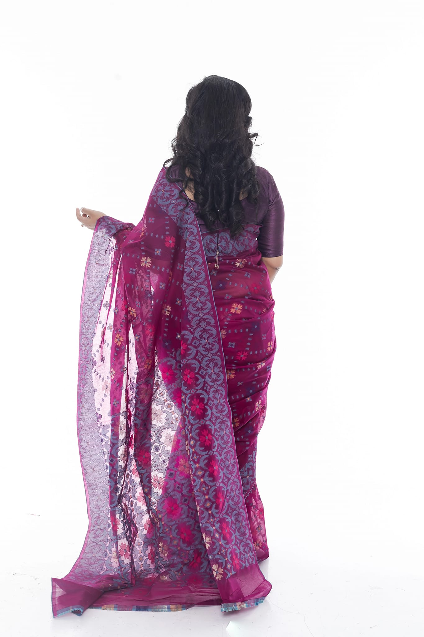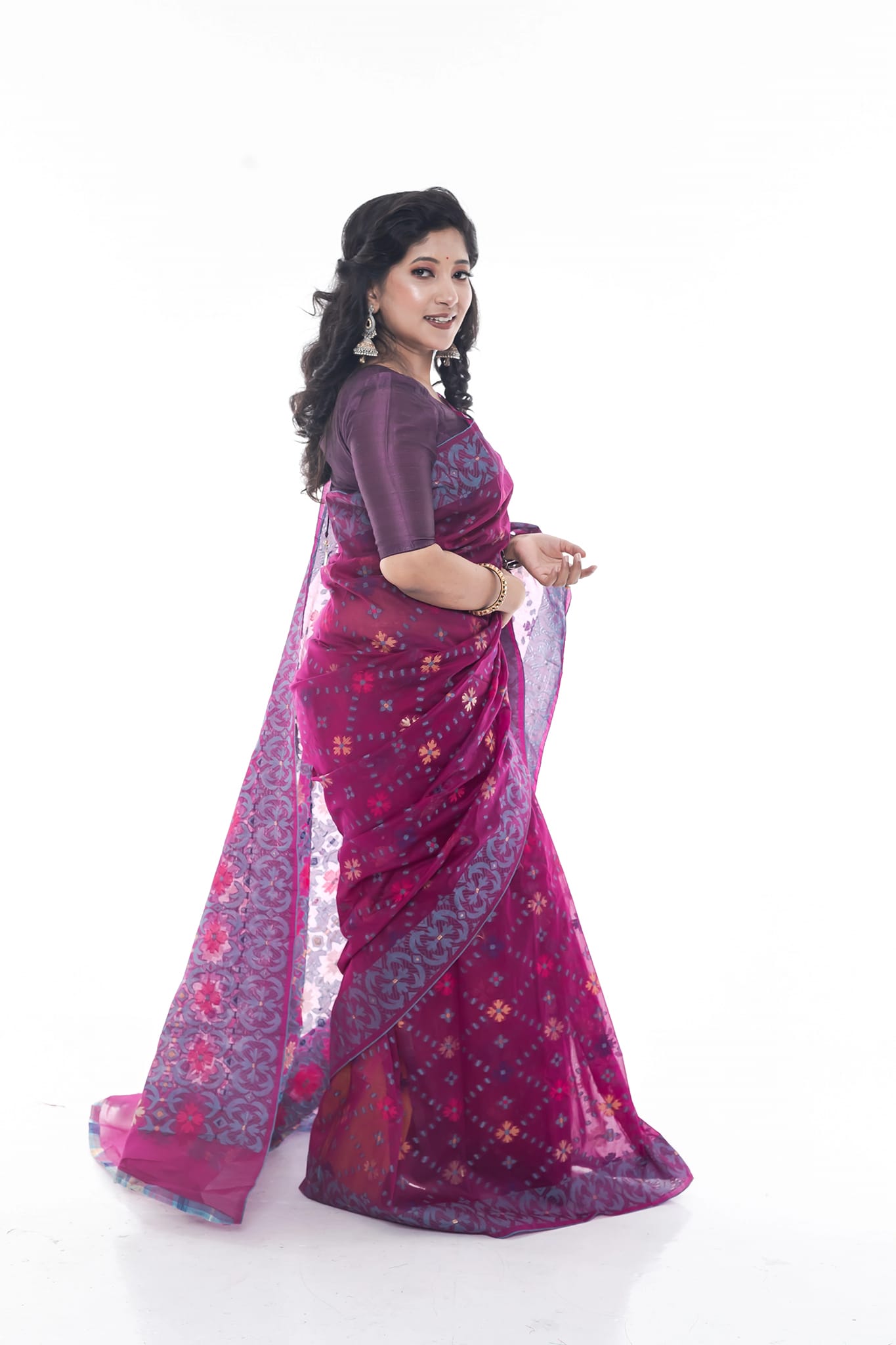 The rich magenta color of the saree exudes sophistication and elegance. The half-silk fabric ensures a luxurious feel and a graceful drape, making it easy to wear and manage throughout the day or night. The intricate patterns and designs woven into the saree add a touch of traditional artistry, while the modern color palette keeps it trendy and fashionable.